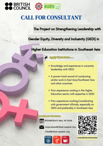 SEAMEO RIHED has been implementing the Project on Strengthening Leadership with Gender Equity, Diversity and Inclusivity (GEDI) in Higher Education Institutions (HEIs) in Southeast Asia since 2022, with the support from the British Council.